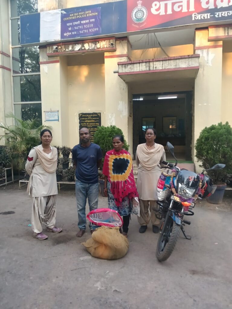 रायगढ़, 19 अक्टूबर । पुलिस अधीक्षक श्री दिव्यांग पटेल के दिशा-निर्देशन एवं नगर पुलिस अधीक्षक श्री मयंक तिवारी के मार्गदर्शन में चक्रधरनगर पुलिस ने शराब तस्करी पर बैक टू बैक कार्रवाई करते हुए चार आरोपियों को गिरफ्तार कर 29 लीटर महुआ शराब और दो मोटर सायकल जप्त की है। दोनों ही कार्रवाइयों में पुलिस ने मौके पर घेराबंदी कर तस्करों को पकड़ा। पहली कार्रवाई ग्राम बरलिया बस्ती मंच के पास की गई, जहां मोटर सायकल क्रमांक CG 13 AL 3751 को रोककर तलाशी लेने पर चालक चंद्रिका सारथी पिता समारू सारथी (26 वर्ष) एवं पीछे बैठे सालिक राम सिदार पिता संतु लाल सिदार (40 वर्ष), दोनों निवासी बरलिया, के कब्जे से दो जरीकेन में 10-10 लीटर और एक पेप्सी बोतल में दो लीटर सहित कुल 22 लीटर कच्ची महुआ शराब बरामद हुई। दोनों आरोपियों ने शराब को बिक्री के लिए ले जाना बताया, जिस पर हीरो HF DELUX मोटर सायकल और शराब जप्त कर उन्हें थाना लाया गया।