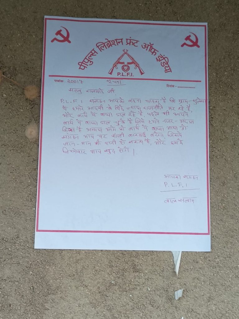 बता दें, पूर्व उपसरपंच के घर चस्पा किए गए पर्चे पर लिखा है कि आप हमारे आदमी के साथ ज्यादा राजनीति कर काम में बाधा डाल रहे हैं. पहले भी आपने हमारे काम में बाधा डाला था, जिसे नक्सल संगठने ने नजर-अंदाज कर दिया था. लेकिन अब फिर से आप राजनीति कर हमारे काम के बीच में आ रहे हैं. साथ ही चेतावनी देते हुए लिखा कि अगर आपने अगली बार ऐसा किया, तो आप पर कार्रवाई की जाएगी, जिसमें आपको जान-माल की हानि होगी.