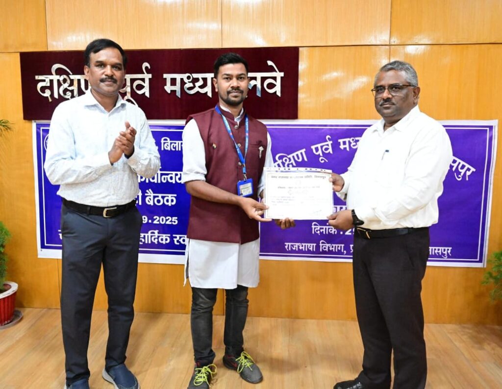 क्षेत्रीय राजभाषा कार्यान्वयन समिति, बिलासपुर की 74वीं बैठक तथा राजभाषा पखवाड़ा 2025 का पुरस्कार वितरण समारोह श्री तरुण प्रकाश, महाप्रबंधक, दक्षिण पूर्व मध्य रेलवे, बिलासपुर की अध्यक्षता में ज़ोनल सभाकक्ष, तृतीय तल, दक्षिण पूर्व मध्य रेलवे, बिलासपुर में संपन्न हुआ । बैठक के प्रारंभ में श्री शिवशंकर लकड़ा, मुख्य राजभाषा अधिकारी एवं मुख्य सामग्री प्रबंधक – । ने महाप्रबंधक, अपर महाप्रबंधक, सभी विभाग प्रमुख, मंडलों/कारखानों से पधारे अपर मंडल रेल प्रबंधक तथा मुख्य कारखाना प्रबंधक के साथ ही राजभाषा पखवाड़ा 2025 के अंतर्गत आयोजित प्रतियोगिताओं के पुरस्कार विजेता अधिकारियों/कर्मचारियों का स्वागत किया ।