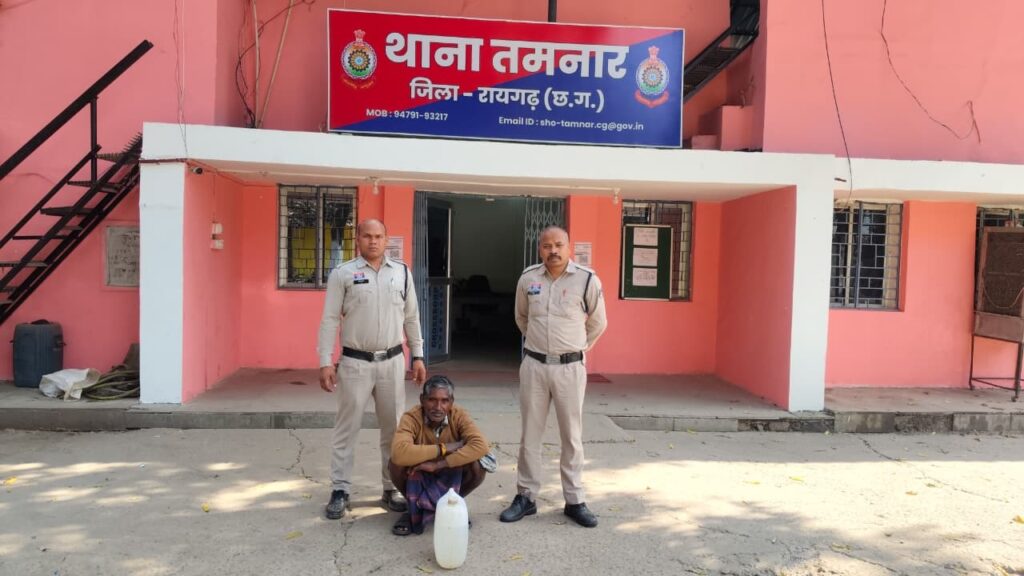 तमनार थाना क्षेत्र में थाना प्रभारी कमला पुसाम ठाकुर, सहायक उप निरीक्षक सुरीत लाल सिदार द्वारा ग्राम बागबाडी, बुडिया एवं सारसमाल क्षेत्र में पेट्रोलिंग पर थे। इस दौरान मुखबिर सूचना पर ग्राम सारसमाल में दशाई भगत (67 वर्ष) निवासी सारसमाल को पकड़ा गया। आरोपी के कब्जे से 09 लीटर हाथ भट्ठी कच्ची महुआ शराब, अनुमानित कीमत 1,800 रुपये तथा बिक्री रकम 150 रुपये जप्त की गई।